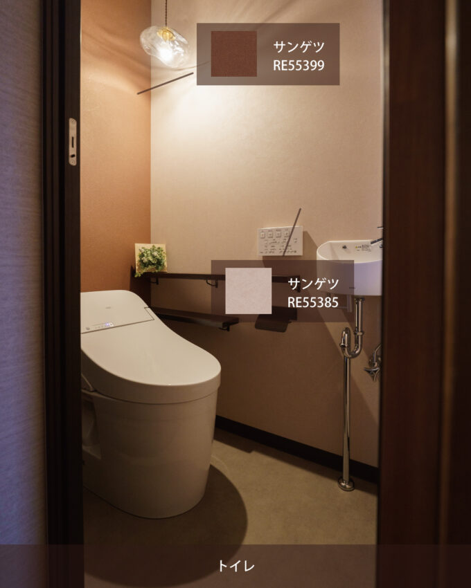 こちらのトイレは、ブラウンやベージュの壁紙を取り入れています。ペンダントライトのオレンジ色の光と、壁紙の色味で落ち着いた雰囲気のトイレになっています。(^^)うっかり寝てしまいそうなくらい、落ち着いた雰囲気で素敵です。