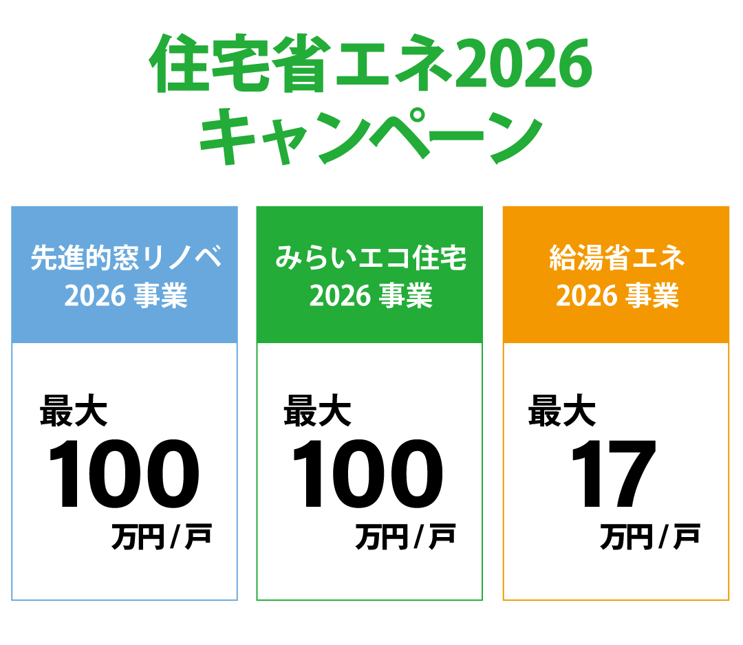 | みらいエコ住宅2026事業 | 新築だけでなく、既存住宅の断熱改修や省エネリフォーム全般を支援。断熱性能向上、窓・外壁・給湯など総合的な改修が対象。リフォームでは最大補助額100万円/戸が見込まれる。 |