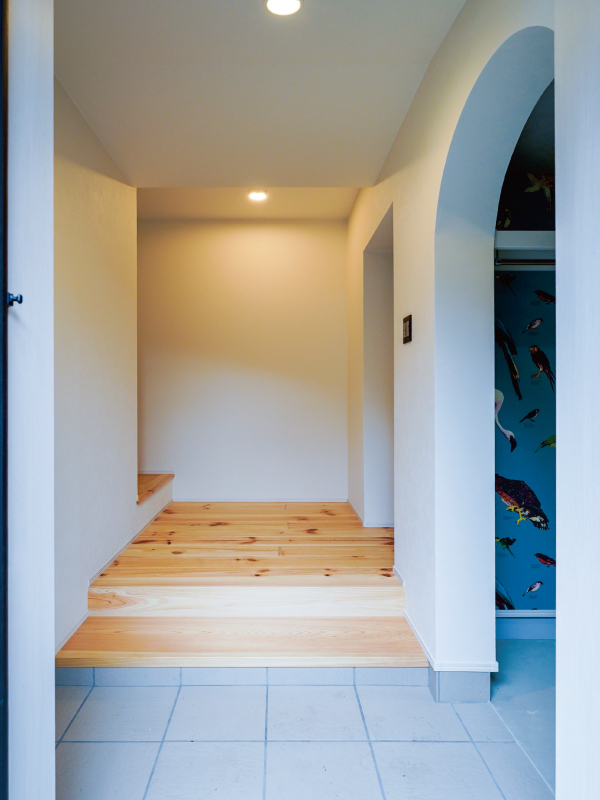 土間の入り口をアーチ型にすることで、空間に柔らかい印象を与えています。