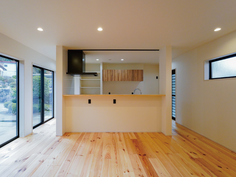 足触りの良さが伝わってくる、明るい色の無垢フローリングが開放感を演出しています。