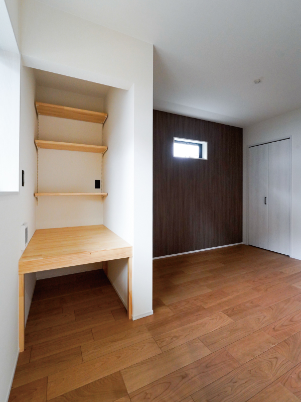 部屋の一角をデスクスペースにすることで、テレワークや勉強に最適な空間が確保されています。
