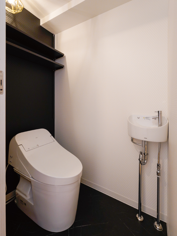 背面の壁にマットなブラックのアクセントクロスを採用し、床も黒の石目調で統一することで、