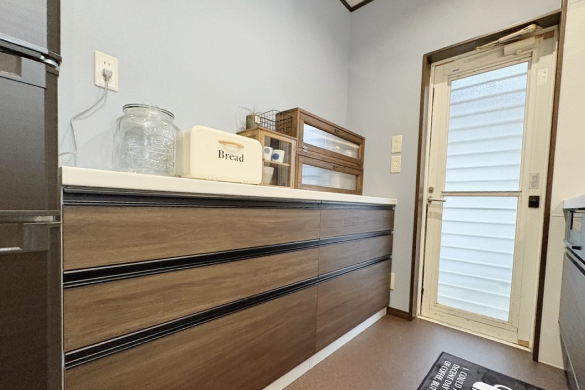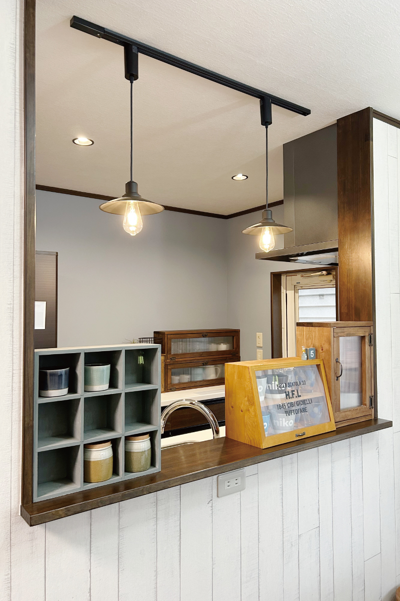 既存の焦げ茶色ベースに水色を組み合わせ、和も感じられるようなキッチンに仕上げてもらった事。そこから続く洗面所のタイルや、ガーデンルーム。好きな物だらけに囲まれた居心地のいい家です。最高です!